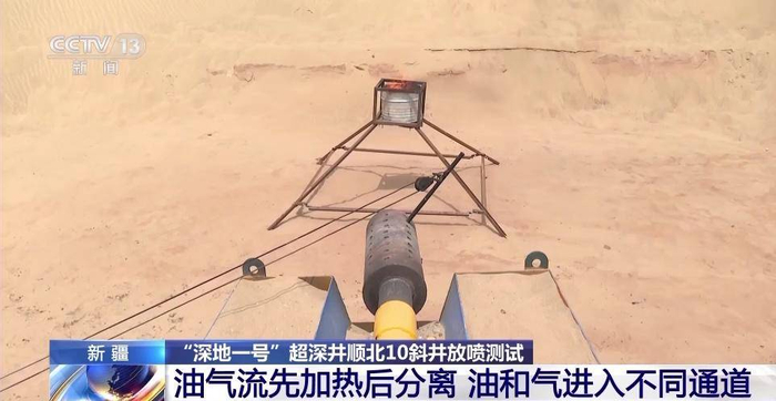 在距离“深地一号”跃进3-3井260多公里之外,位于塔克拉玛干沙漠腹地,有另外一口“深地一号”的超深井——顺北10斜井已经钻探完毕,井深8591米,今天正式放喷点火,来测试这口井是否有油气流。