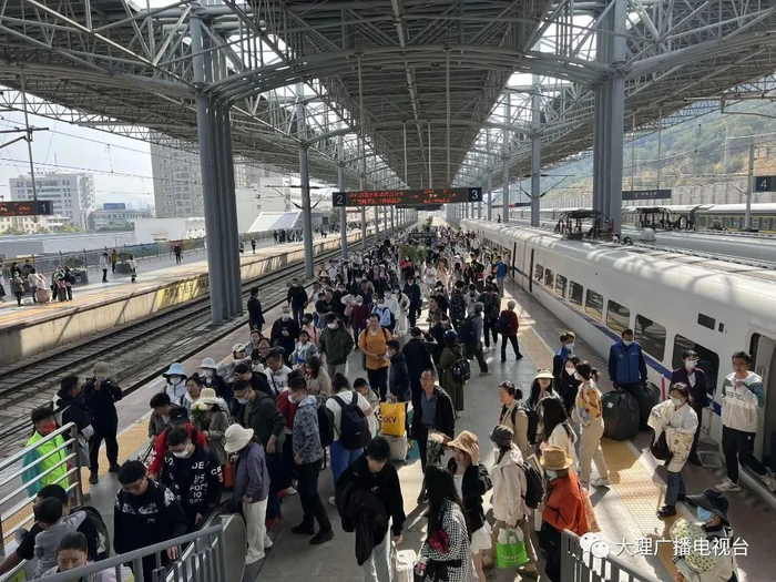 与此同时,统计数据显示,4月29日(4月28日18点至4月29日18点,下同)大理火车站开行列车61对,其中重联动车组列车29对;发送旅客38832人次,到达旅客47943人次,到发合计86775人次,刷新大理火车站客流纪录。4月30日开行列车59对,其中重联动车组列车26对,到发合计75834人次。5月1日开行列车57对,其中重联动车组列车25对,到发合计67687人次。