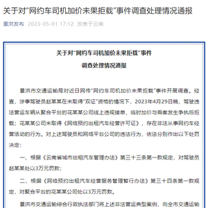 景洪市交通运输局通报称,经查,涉事驾驶员赵某某在未取得“双证”资格的情况下,4月29日晚,驾驶违法营运车辆从聚合平台的花某某公司线上违规接单,临时加价与乘客发生争执后拒载;花某某公司未取得《网络预约出租汽车经营许可证》,存在非法从事网约车经营活动的行为。据此,根据《云南省城市出租汽车管理办法》第三十三条第一款规定,对驾驶员赵某某处以3万元罚款;根据《网络预约出租汽车经营服务管理暂行办法》第三十四条第一款规定,对聚合平台的花某某公司处以3万元罚款。