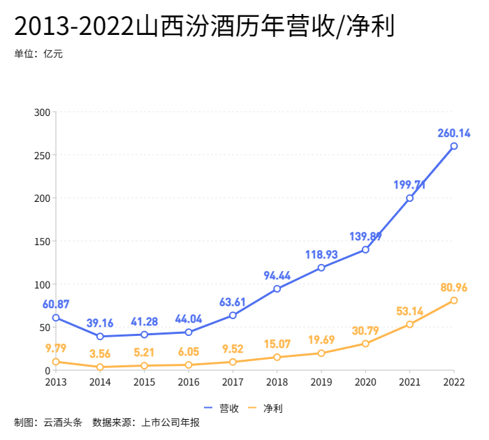 日前,山西汾酒公布2022年营收业绩,期内公司实现260.14亿元营收,80.96亿元净利润,分别同比增长了31.26%、52.36%,营收、净利双增幅在白酒上市公司前十中位列第一,创下历史新高。
