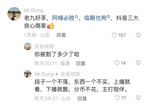 老九的暴利,不仅没有让粉丝嫉妒,反倒引起了不少粉丝的好感。很多粉丝留言:“一天不被老九骗,就浑身难受。明明可以抢我的钱,老九却还会送我一包成本 20 的茶叶。真的是大大的好人。”