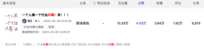 而小红书上,行业内幕也成为互动率极高的笔记类型,比如《一人爆一个行业内幕》就有 4.53 万点赞,1.92 万评论。