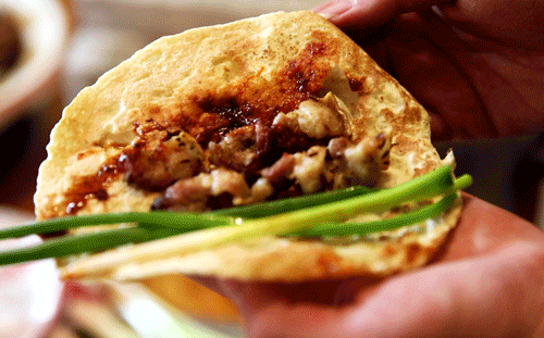 吃烤肉,就是要一把一把吃,这样才能显出西北人的“干散”。兰州的烤肉,两个瘦肉中间夹着一块肥肉,油光发亮,红通通的辣椒点缀着肉块,一口下去,满福!