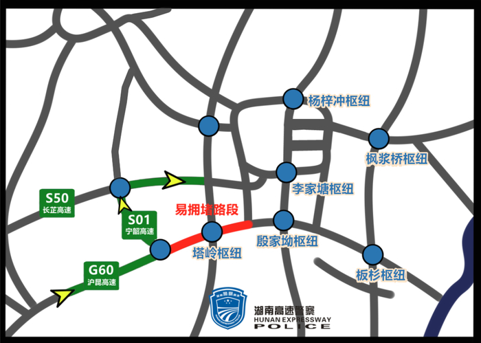 2.特别提示:S20平洞高速平益段已通车,驾驶人朋友可选择:平洞高速→六塘枢纽→许广高速南下进入长沙市区。