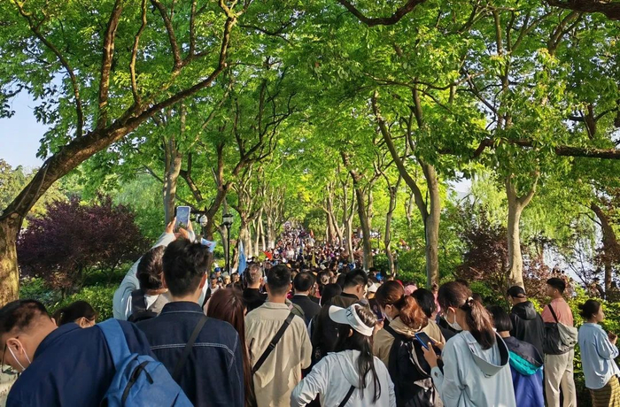 5月1日早上7点多,西湖苏堤已经排起长队。新华社/图