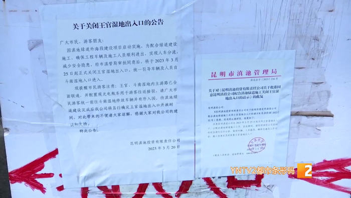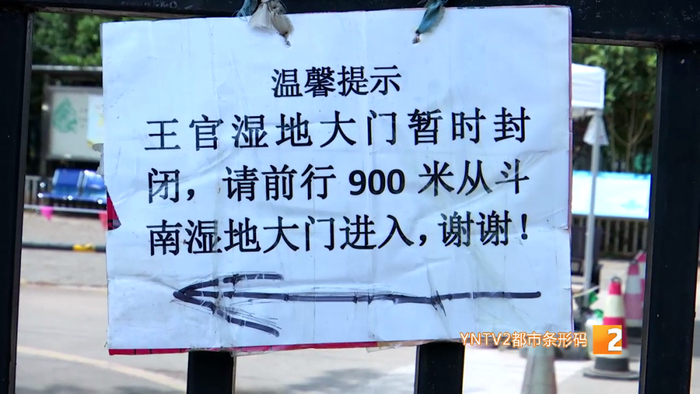 湿地大门上张贴的公告显示,为配合滇池绿道外海段建设项目施工,王官湿地出入口从今年3月25日起关闭。王官、斗南湿地内主游路已全面联通,市民游客可从斗南湿地大门进入。