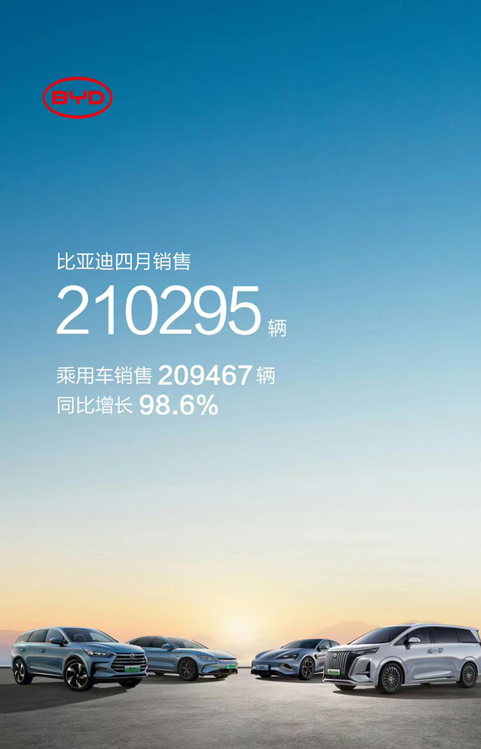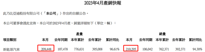 2023年5月2日,比亚迪在港交所公告称,2023年4月,新能源汽车销量约21.03万辆,同比增长98.31%,并且单月销量超产量。