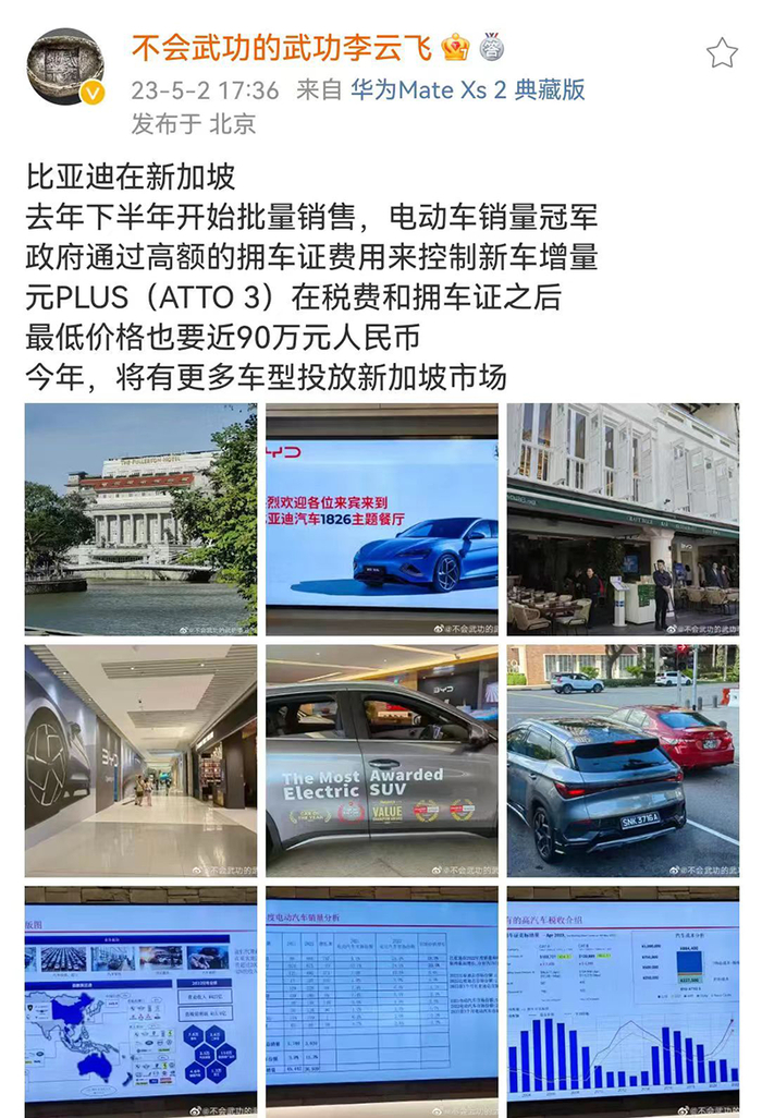 2023年5月2日,比亚迪品牌及公关处总经理李云飞发布微博称,比亚迪2022年下半年在新加坡开始批量销售,2023年将有更多车型投放新加坡市场。