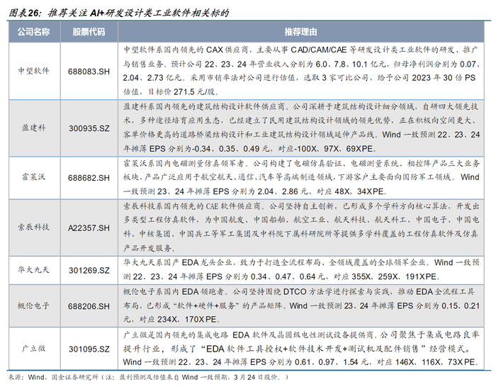 国金证券指出,在AI+落地过程中,服务增值化、软件正版化、国产信创化三重利好共振下,国产工业研发设计厂商或将深度受益于本轮AI+大潮。推荐关注中望软件、盈建科、霍莱沃、索辰科技、华大九天、概伦电子和广立微等。
