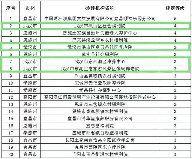 根据湖北省民政厅网站公示2022年养老机构等级评定结果,此次我省评出20家三级及以上养老机构,其中五级养老机构1家、四级养老机构3家、三级养老机构16家。武汉市4家养老机构在公示名单中,其中洪山区社会福利院获评四级,洪山区卓刀泉社区养老院、东西湖区康养中心、东湖生态旅游风景区布瑞养老院获评三级。