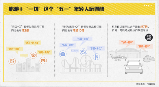 飞猪数据显示,今年“五一”,包含演出、玩乐、电竞、餐饮等体验元素在内的“酒店+X”套餐类商品备受青睐,预订量同比去年增长超2倍;同样地,包含汉服、旅拍、展览等体验元素在内的“景区/乐园+X”商品也受热捧,预订量同比去年增长超10倍。以无锡拈花湾景区为例,其中包含了禅意体验、禅食等元素在内的套餐成为景区门票以外最受欢迎的旅游商品。