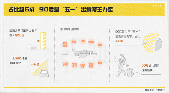 第一批“玩得酷”的人已经开始发现新的境外目的地了。飞猪数据显示,“五一”假期出境游预订量同比去年增长超10倍,其中90后是今年“五一”假期出境游的主力军,占比超6成。值得一提的是,很多00后甚至05后也开始首次在飞猪上预订出境游,飞猪数据显示,在出境游客群中,00后的占比提升速度最快。
