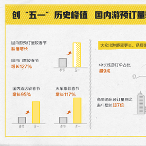尽管假期时长相较于春节短了2天,但今年“五一”假期国内游客的出游热情远高于春节。飞猪数据显示,今年“五一”假期国内游预订量相较于春节翻倍增长,创下了“五一”假期历史峰值。其中,国内门票较春节增长127%,国内酒店较春节增长95%,火车票较春节增长117%。