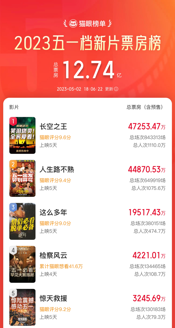 截止发稿前,《人生路不熟》的单日票房成绩依旧位列五一档新片之首,与《长空之王》的总票房差距也仍在以肉眼可见的速度缩短。