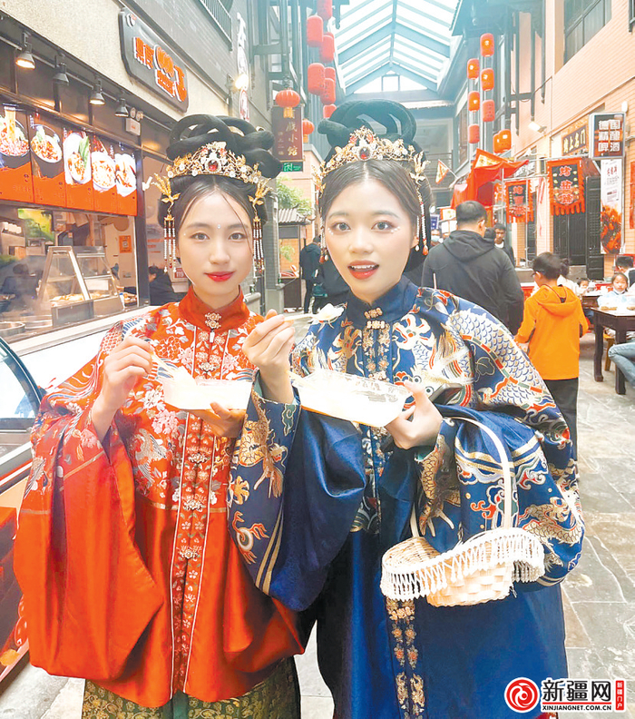5月1日,在位于乌鲁木齐县水西沟镇的闲来小镇,身着传统服饰的演员在品尝美食。