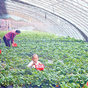5月2日,游客在乌鲁木齐县水西沟镇牛牛家草莓采摘园里采摘草莓。