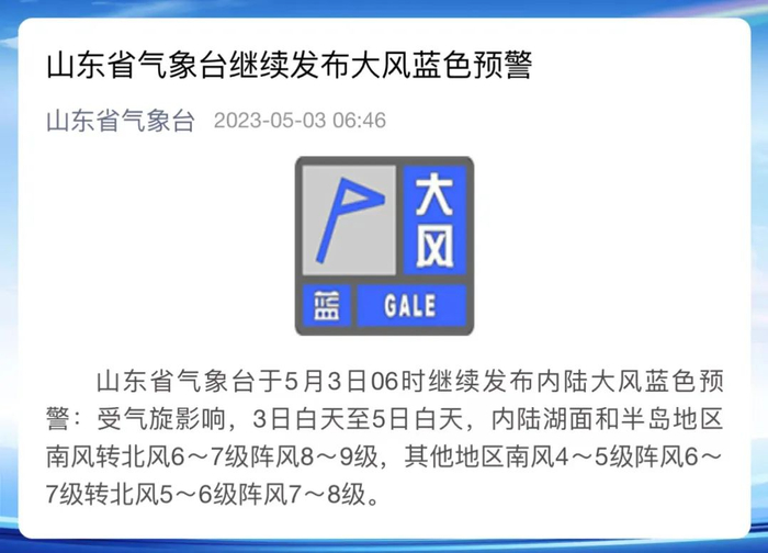 3日夜间至5日白天,渤海、渤海海峡、黄海北部和中部南风转北风7~8级阵风9~10级;3日白天至5日白天,内陆湖面和半岛地区南风转北风6~7级阵风8~9级,鲁西北地区北风4~5级增强到5~6级阵风7~8级,其他内陆地区南风4~5级阵风6~7级转北风5~6级阵风7~8级。