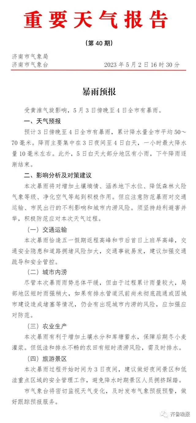济南3日傍晚至4日全市有暴雨