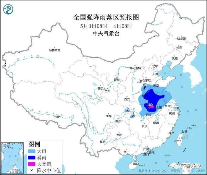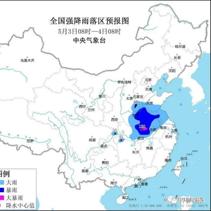 预计,5月3日08时至4日08时,河南中东部、山东西部和南部、安徽中北部、江苏中北部、湖北南部和中东部、重庆北部等地部分地区有大到暴雨,其中,河南东南部、湖北东北部、安徽西南部等地局地有大暴雨(100~120毫米)。
