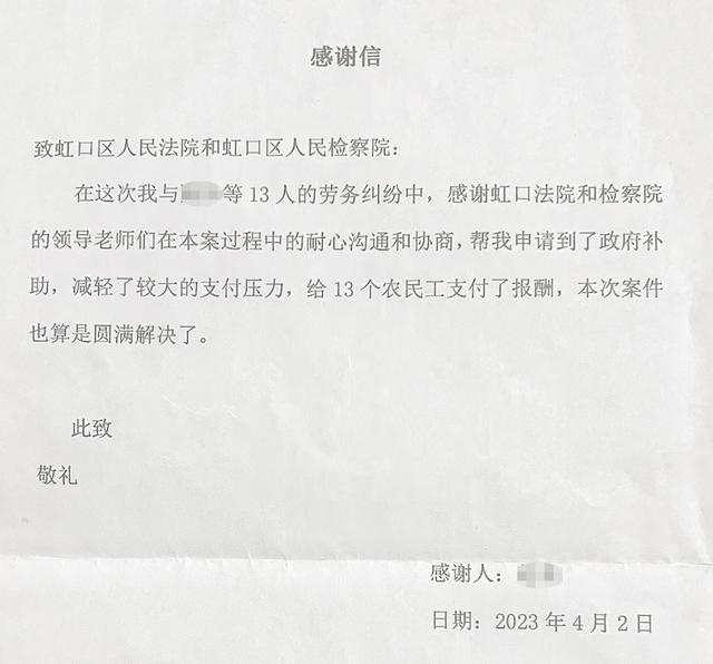 “感谢虹口法院和检察院的领导、老师们在本案过程中的耐心沟通和协商,帮我申请到了政府补助,减轻了较大的支付压力……”4月初,同一批劳动合同纠纷案件的被告赵某同时向检察机关和法院寄来一封感谢信。