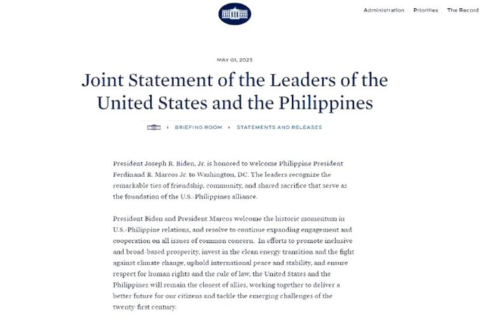 在美菲领导人会晤后,白宫在其网站发布《美菲领导人联合声明》。声明称,拜登总统重申美国对美菲同盟的坚定承诺。两国领导人欢迎根据美菲《加强防务合作协议》确定新的军事基地。声明称,双方期待建立菲律宾、日本和美国以及菲律宾、澳大利亚和美国的三边合作机制。