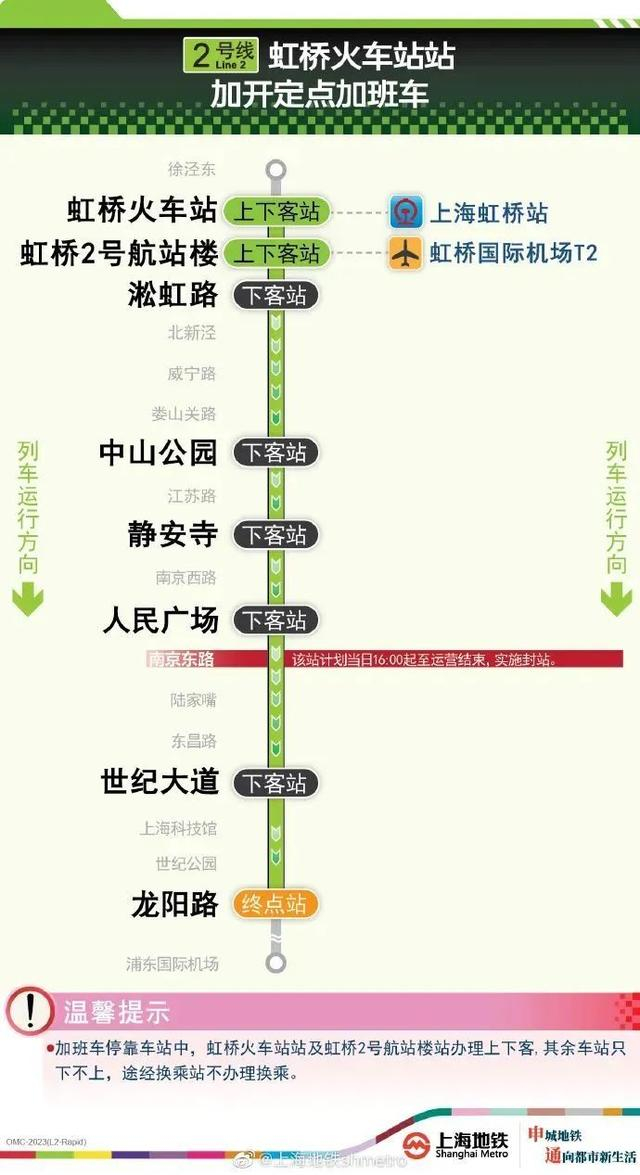 记者从申通地铁获悉,考虑到今日夜间虹桥火车站乘客密集到达,为方便夜间抵沪乘客出行,地铁2号线虹桥火车站加班车延长运营至明日1时30分,定点加开列车途经换乘站均不可换乘。其中,2号线虹桥火车站站往龙阳路站方向定点加班车,沿途仅停靠虹桥火车站站、虹桥2号航站楼站、淞虹路站、中山公园站、静安寺站、人民广场站、世纪大道站、龙阳路站、其余车站跳停。停靠车站中,虹桥火车站站、虹桥2号航站楼站可上下客,其余车站只下不上,途经换乘站不可换乘。