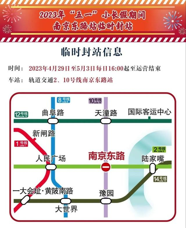 根据交通管制要求,4月29日至5月3日每日16时至运营结束,地铁2、10号线南京东路站实施封站。封站时段内在2、10号线南京东路站不能上下车,地铁站出入口也将关闭,乘客不能进出车站。届时,车站将加强站内广播宣传、导向设置、站台站厅秩序维护等工作。同时,周边站点也将视情采取客流管控措施,以确保乘客安全,届时请现场乘客配合车站工作人员指引。
