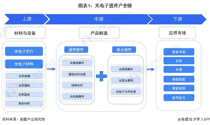 光电子器件上游主要由光电子材料、光电子芯片组成;中游细分领域较为广泛,有光通信器件、通信光纤光缆、光传感器件、光照明器件、光显示器件以及光电子器件封装等;下游则是智能手机、安防、车载、照相投影、智能家居、航空航天等。
