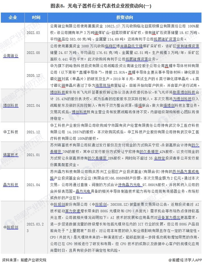 2020年以来,光电子器件行业代表性企业的投资动向主要包括收购公司拓展业务、通过对子公司增资的方式投资光电子器件生产基地项目。光电子器件行业代表性企业最新投资动向如下: