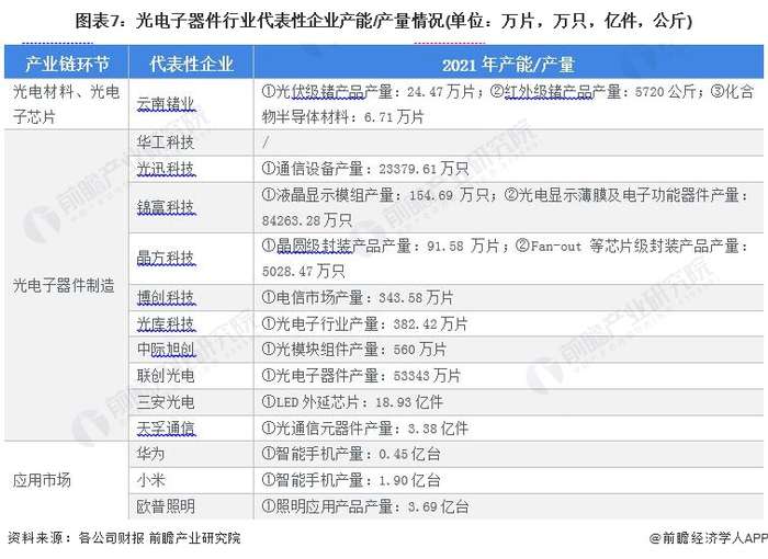 目前,上游原材料与设备的主要企业有云南锗业、福晶科技等;中游为光电子器件制造企业,主要有华工科技、武汉光迅科技、锦富科技等;下游应用市场广阔,代表性企业有华为、小米、中国移动、欧普照明等。