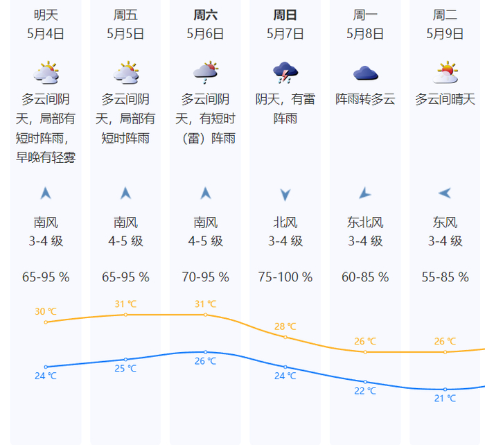5月3日多云间阴天,气温26-29℃;4-6日多云,部分时间有短时阵雨,气温上升,午间体感较热。返程高峰早晚有轻雾,部分时段能见度较低,需注意谨慎驾驶。