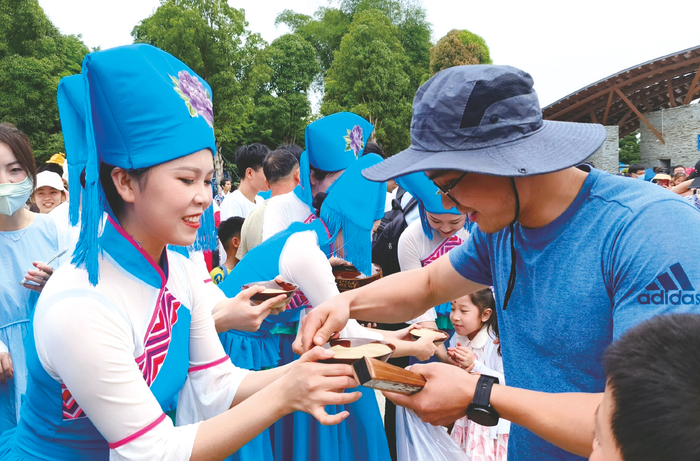 壮族风情,“五一”继续精彩,广西区内各景区节目丰富多彩,每天都接待大批游客。记者从广西文化和旅游厅了解到,这个“五一”假期,全区累计接待游客2892.39万人次,同比增长112.8%,比2019年增长53.4%;实现旅游消费205.48亿元,同比增长91.8%,比2019年增长45.1%(按可比口径)。