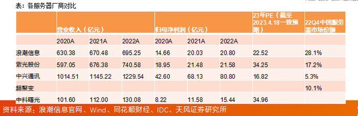 竞争格局:根据IDC发布的《2022年第四季度中国服务器市场跟踪报告Prelim》,浪潮份额国内领先,新华三次之,超聚变排行第三,中兴通讯进入前五。