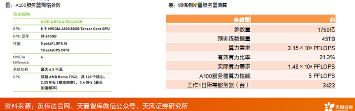 假设应用A100 640GB服务器进行训练,该服务器AI算力性能为5 PFLOPS,最大功率为6.5 kw,则我们测算训练阶段需要服务器数量=训练阶段算力需求÷服务器AI算力性能=2.96×108台(同时工作1秒),即3423台服务器工作1日。