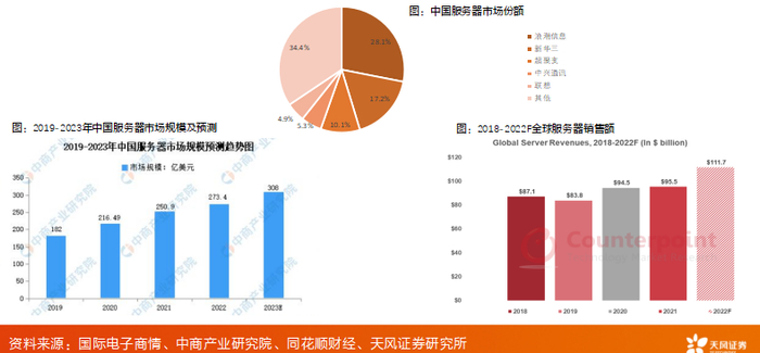 服务器市场规模持续增长。根据 Counterpoint 的全球服务器销售跟踪报告,2022年,全球服务器出货量将同比增长6%,达到 1380 万台。收入将同比增长 17%,达到1117 亿美元。根据IDC、中商产业研究院,我国服务器市场规模由2019年的182亿美元增长至2022年的273.4亿美元,复合年均增长率达14.5%,预计2023年我国服务器市场规模将增至308亿美元。