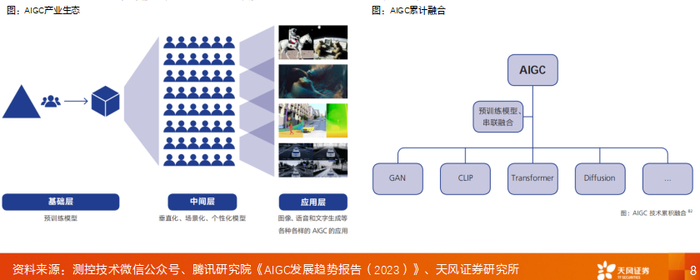 目前,AIGC产业生态体系的雏形已现,呈现为上中下三层架构:①第一层为上游基础层,也就是由预训练模型为基础搭建的AIGC技术基础设施层。②第二层为中间层,即垂直化、场景化、个性化的模型和应用工具。③第三层为应用层,即面向C端用户的文字、图片、音视频等内容生成服务。