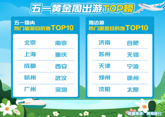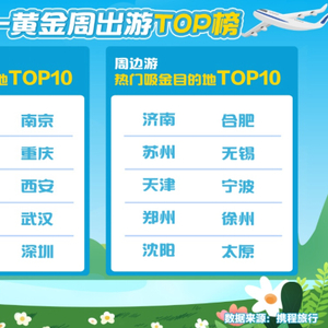 旅游目的地方面,根据目的地旅游整体订单量,报告发布了五一“热门旅游目的地TOP10”,分别是:北京、上海、成都、杭州、广州、南京、重庆、西安、武汉和深圳。