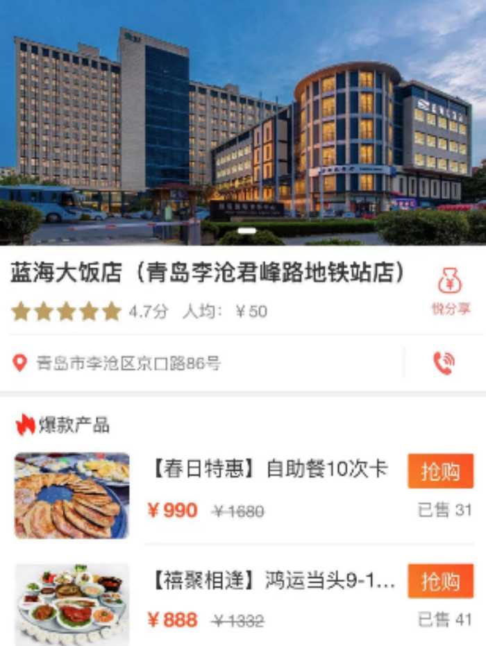 蓝海大饭店开展自助餐节庆主题活动,自助餐活动于4月下旬预热开始,活动期间通过关注蓝海大饭店微信公众号,登陆小程序即可享受美食,将线上优惠于线下体验深度融合。活动期间每日销售额同比增长超10%,客流量同比增长20%。