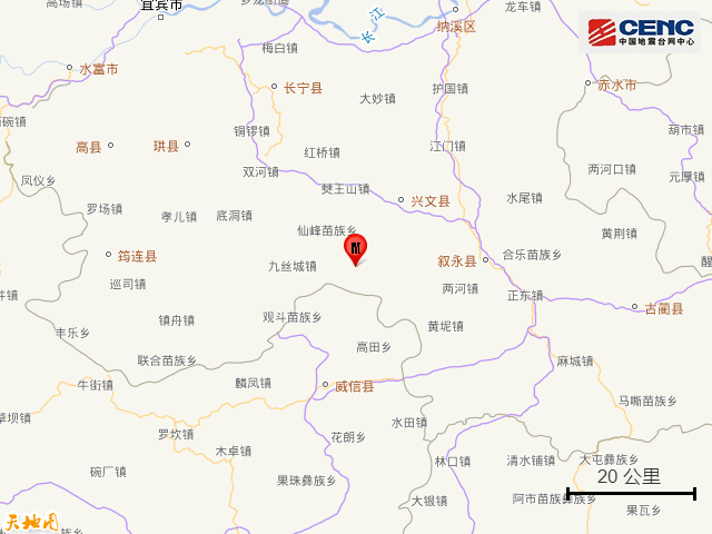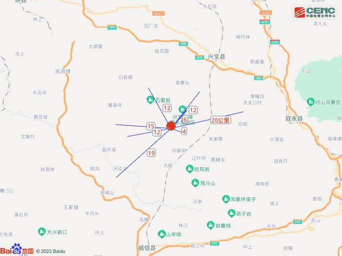周边县城:震中距兴文县22公里、距叙永县32公里、距云南威信县33公里、距珙县52公里、距长宁县53公里,距宜宾市83公里,距重庆市211公里。