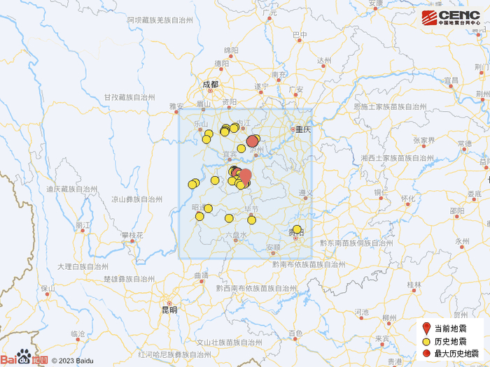 历史地震:根据中国地震台网速报目录,震中周边200公里内近5年来发生3级以上地震共286次,最大地震分别是2021年9月16日在四川泸州市泸县发生的6.0级地震(距离本次震中120公里)和2019年6月17日在四川宜宾市长宁县发生的6.0级地震(距离本次震中31公里),按震级大小前50次历史地震分布如图。