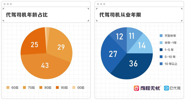 数据显示,代驾司机人群中,87%为男性,其中,80后代驾司机占比最高(43%),70后(29%)和90后(25%)次之。作为劳动力的主力构成,80后处于上有老,下有小的代际重压下,对其而言,代驾的兼职收入是额外、相对可观且获取成本较低的经济来源部分。此外,灵活自主的就业模式,使得代驾司机有趋于年轻化的趋势。