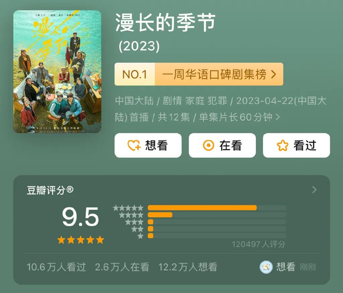 5月1日,范伟主演的悬疑剧《漫长的季节》收官,评分不降反升,足足涨到9.5,打破了八年来国产剧评分的最高纪录,基本上提前锁定了2023年的品质国剧top1。
