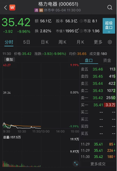今天上午,格力电器下跌9.96%,最新市值为1995亿元,盘中触及跌停。