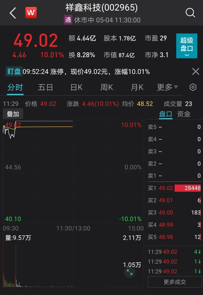 祥鑫科技上午涨停,最新市值为87.4亿元。
