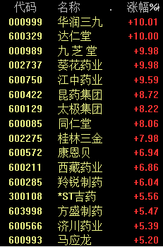 今天上午,中药板块爆发,华润三九、达仁堂、九芝堂等个股涨停。华润三九、达仁堂、同仁堂、太极集团江中药业、羚锐制药等多股股价盘中创历史新高。