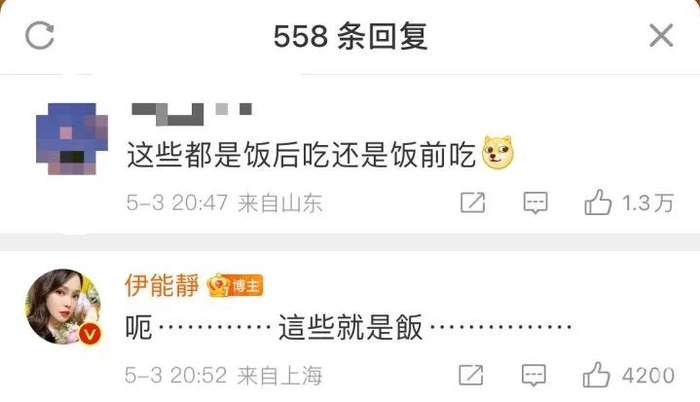 网友一看,顿时呆住了,“这是饭前还是饭后吃?”虽然网友多半是在玩梗,但伊能静还是认真地回复:“呃……这些就是饭”。一时间,不禁令网友们感慨万千:“不管饭前饭后都不够我吃”。