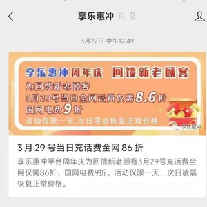 今年2月底,陈利通过该公众号以92折优惠充值200元话费,很快就成功到账了。尝到甜头后,3月22日,该平台发布“3月29日全网话费86折”的活动,他当天立刻充值了200元。