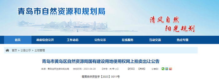 青岛市黄岛区自然资源局国有建设用地使用权网上拍卖出让公告