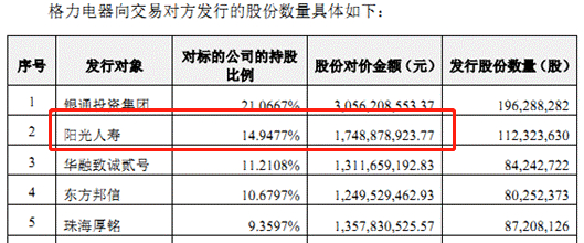 当时珠海银隆有21名股东,其中阳光保险获得格力给出的对价是17.48亿元(股票形式支付)。如果收购方案通过,阳光保险的10亿元出资,获得的收益(税前)将达到7.48亿元,收益率74.8%。