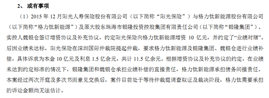 早在2015年12月,阳光保险出资10亿元入股珠海银隆,并约定了业绩对赌。后因珠海银隆业绩不达标,阳光保险要求珠海银隆与原股东承担补偿责任,诉求金额是原来的本金10亿元及利息1.5亿元,总计11.5亿元。